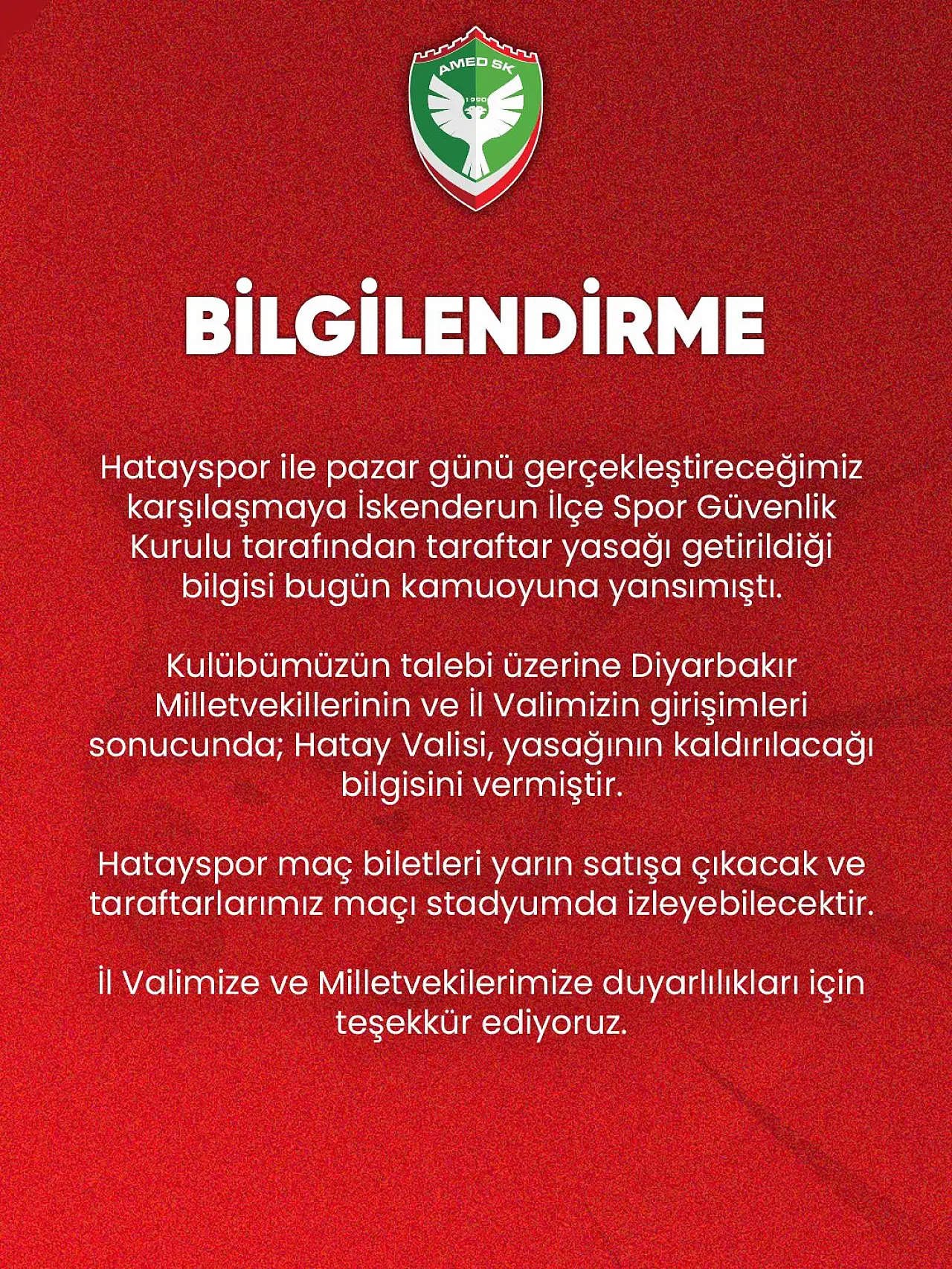 Amedspor tarafından yapılan yazılı açıklamada, İskenderun İlçe Spor Güvenlik Kurulu tarafından alınan yasağın kamuoyuna yansıdığı ancak yapılan girişimler sonucunda kaldırıldığı belirtildi.