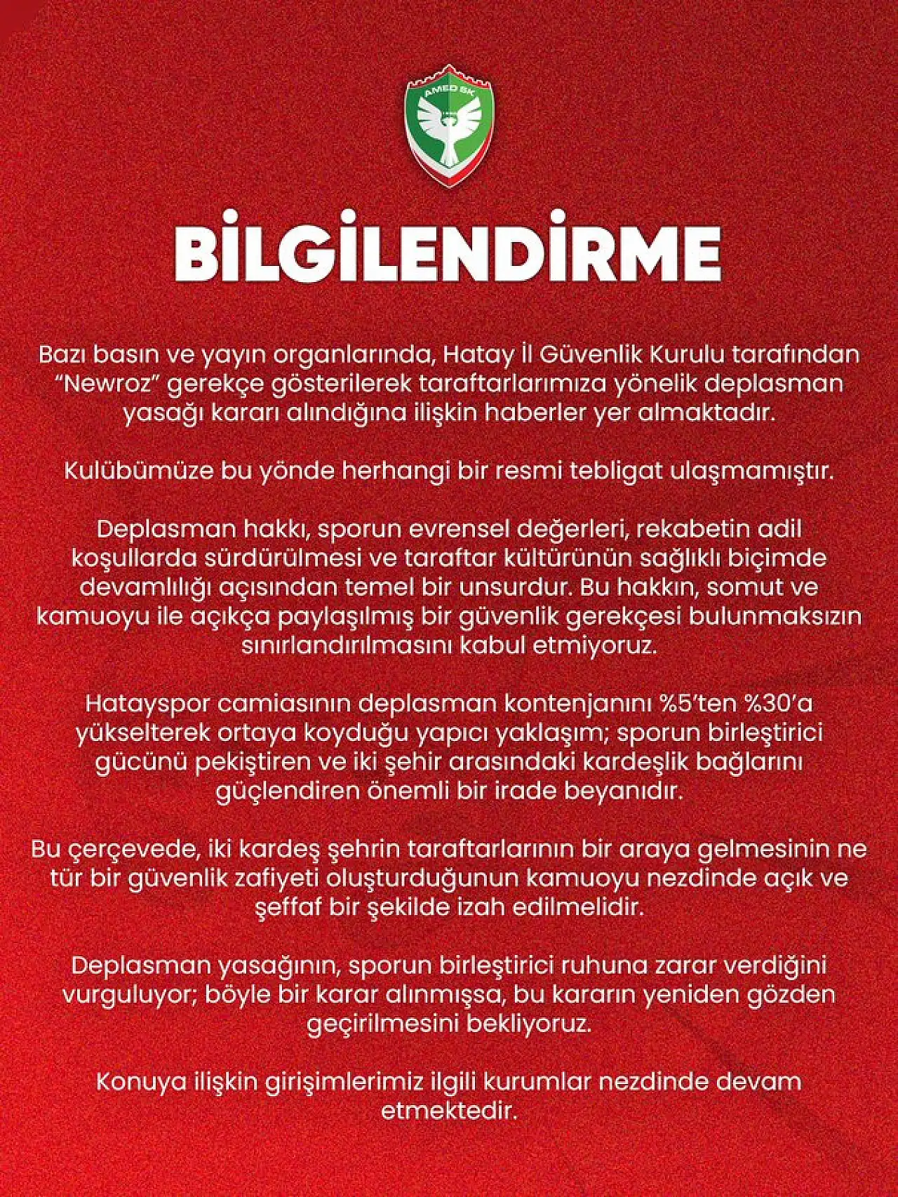 Amedspor’dan yapılan açıklamada, Hatay İl Güvenlik Kurulu tarafından “Newroz” gerekçesiyle deplasman yasağı alındığı yönündeki iddialara değinildi.