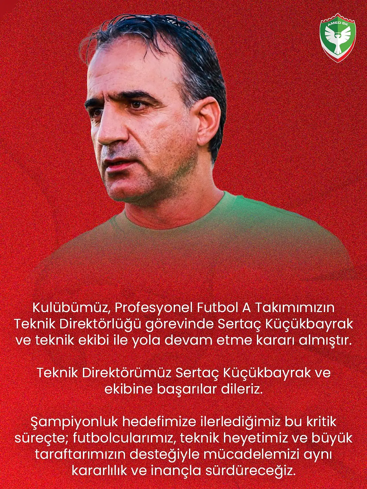 “Profesyonel Futbol A Takımımızın Teknik Direktörlüğü görevinde Sertaç Küçükbayrak ve teknik ekibi ile yola devam etme kararı almış bulunmaktayız. Hocamıza ve ekibine başarılar dileriz.”