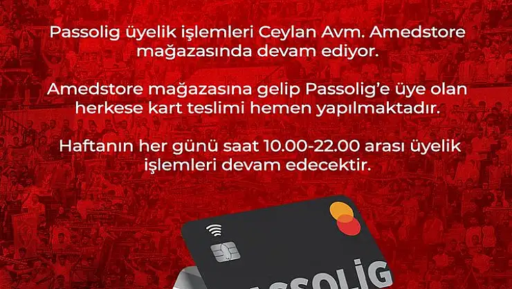 Amedstore mağazasında Passolig üyelik işlemleri, haftanın her günü, sabah 10.00 ile akşam 22.00 arasında yapılacak. Taraftarlar, mağazaya uğrayarak hızlı bir şekilde üye olabilir ve kartlarını alabilirler.